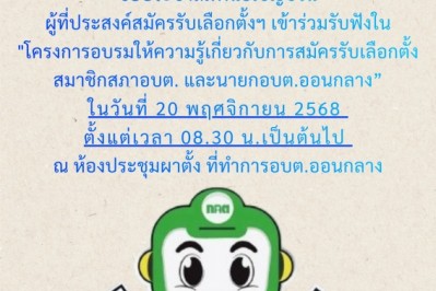 ขอประชาสัมพันธ์เชิญชวน ผู้ที่ประสงค์สมัครรับเลือกตั้งฯ เข้าร่วมรับฟังใน "โครงการอบรมให้ความรู้เกี่ยวกับการสมัครรับเลือกตั้งสมาชิกสภาอบต. และนายกอบต.ออนกลาง