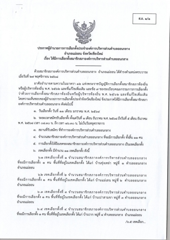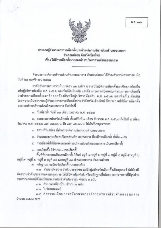 ประกาศให้มีการเลือกตั้งสมาชิกสภาอบต.ออนกลางและนายกอบต.ออนกลาง