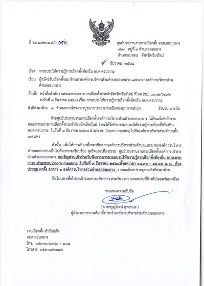 >>> ศูนย์ประสานงานการเลือกตั้งอบต.ออนกลาง ขอประชาสัมพันธ์แจ้งให้ผู้สมัครรับเลือกตั้งสมาชิกสภาอบต.ออนกลาง และนายกอบต.ออนกลาง ตลอดจนทีมงานผู้ช่วยหาเสียงเลือกตั้งของผู้สมัครรับเลือกตั้ง เข้าร่วมอบรมรับฟังการให้ความรู้เกี่ยวกับการเลือกตั้งฯ ซึ่งจัดโดย "สำนักงานคณะกรรมการการเลือกตั้งจังหวัดเชียงใหม่" ผ่านระบบ Zoom meeting ในวันอังคารที่ 9 ธันวาคม 2568 ตั้งแต่เวลา 08.30 น. เป็นต้นไป ณ ห้องประชุมผาตั้ง อาคาร 1 ที่ทำการอบต.ออนกลาง