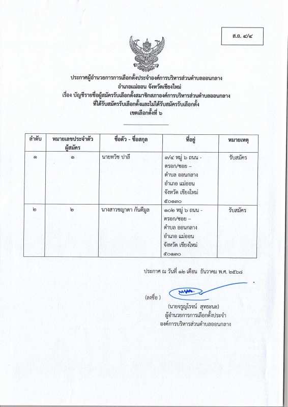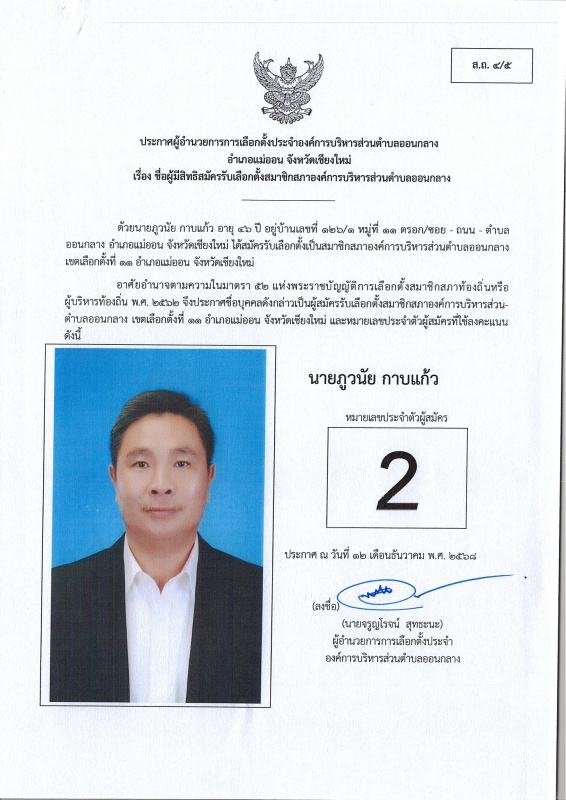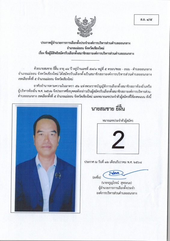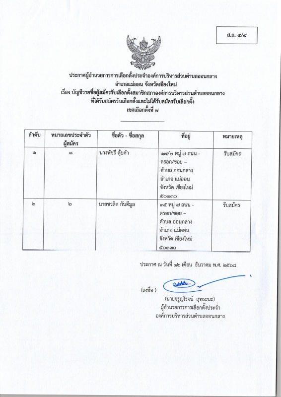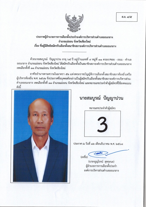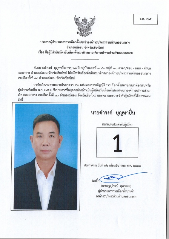 >>>ประกาศบัญชีรายชื่อผู้สมัครรับเลือกตั้งสมาชิกสภาอบต.ออนกลาง และนายกอบต.ออนกลาง (ส.ถ./ผ.ถ.4/4) และ ประกาศชื่อผู้มีสิทธิสมัครรับเลือกตั้งฯ (ส.ถ./ผ.ถ.4/5)