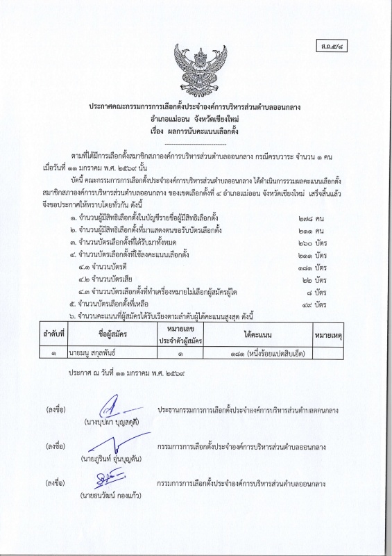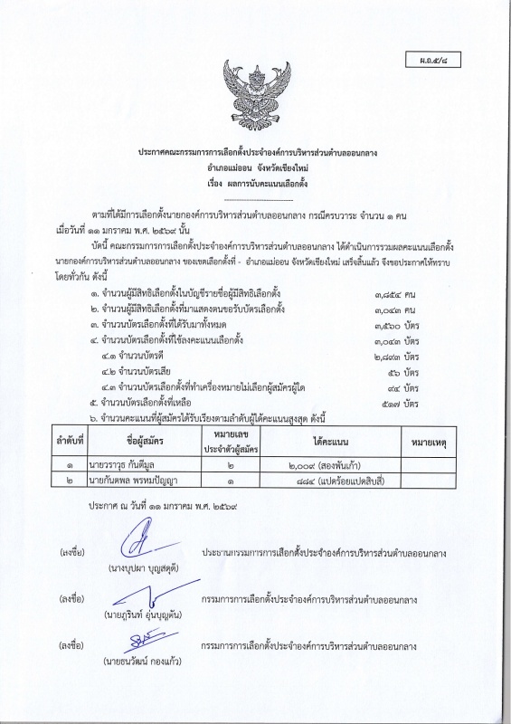 ประกาศ กกต.อบต.ออนกลาง (ส.ถ./ผ.ถ.5/8) เรื่อง ผลการนับคะแนนเลือกตั้ง