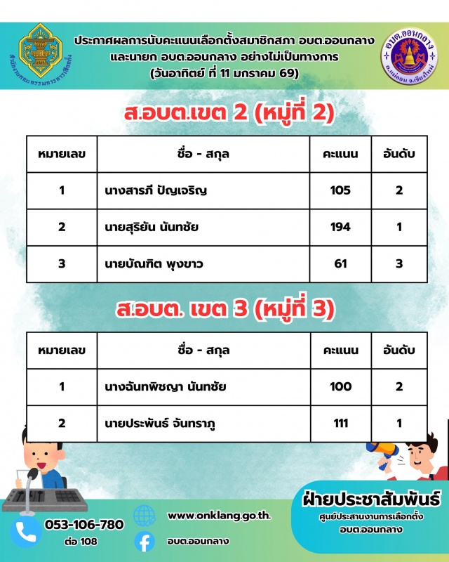 ประกาศผลการนับคะแนนเลือกตั้งสมาชิกสภา อบต.ออนกลาง และนายก อบต.ออนกลาง อย่างไม่เป็นทางการ