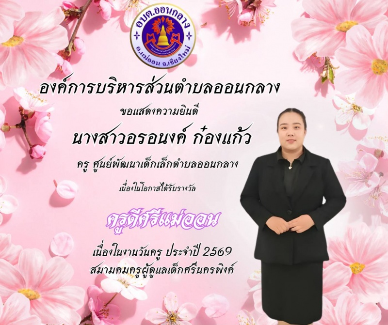 อบต.ออนกลาง ขอแสดงความยินดี นางสาวนันทินี พรมเสน และ นางสาวอรอนงค์ ก๋องแก้ว ครู ศพด.ตำบลออนกลาง เนื่องในโอกาสได้รับรางวัล ครูดีศรีแม่ออน เนื่องในวันครู ประจำปี 2569