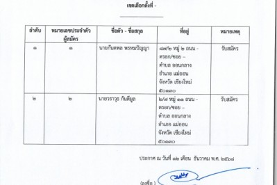 จำนวนผู้สมัครฯ และรายชื่อผู้สมัครรับเลือกตั้งสมาชิกสภาอบต.ออนกลาง และนายกอบต.ออนกลาง ระหว่างวันที่ 1-5 ธันวาคม 2568