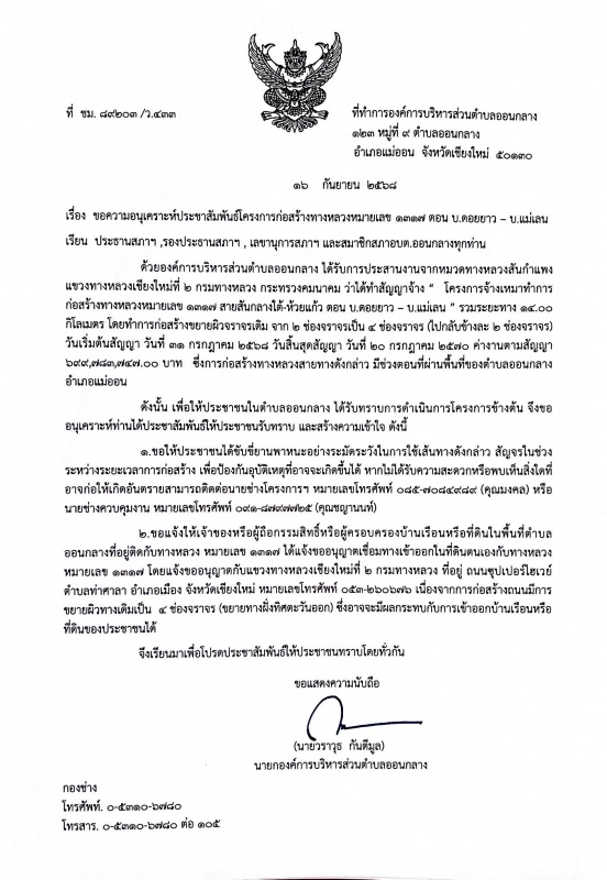 ประชาสัมพันธ์ โครงการก่อสร้างทางหลวงหมายเลข 1317 บ้านดอยยาว-บ้านแม่เลน