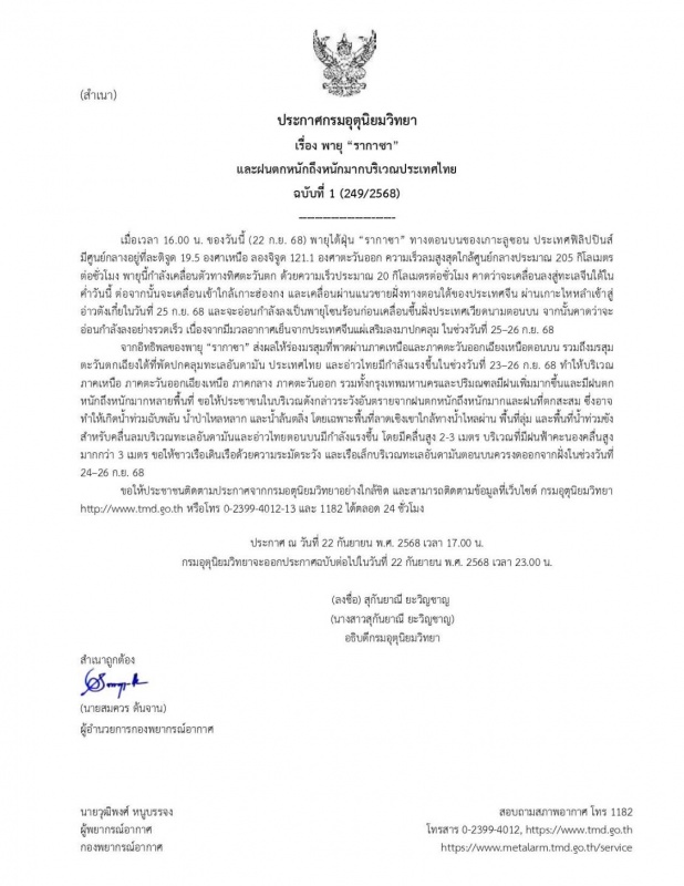 แจ้งเตือน "พายุรากาซา" เนื่องจากช่วงวันที่ 22 - 26 กันยายน 2568