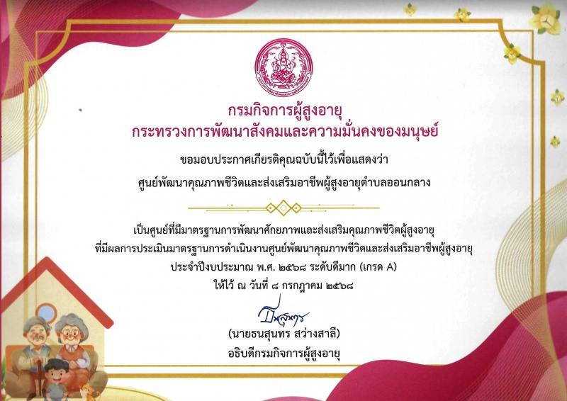 >>> ศูนย์พัฒนาคุณภาพชีวิตและส่งเสริมอาชีพผู้สูงอายุตำบลออนกลาง โดยอบต.ออนกลาง ได้รับรางวัลผลการประเมินมาตรฐานการดำเนินงานศูนย์ฯ ประจำปี 2568 "ระดับดีมาก" (เกรด A) จากกรมกิจการผู้สูงอายุ กระทรวงพม. จากผลการดำเนินงานพัฒนาคุณภาพชีวิตผู้สูงอายุ ในรูปแบบต่างๆ อาทิเช่น สนับสนุนผ้าอ้อมผู้ใหญ่, เตียงผู้ป่วย, รถเข็น, เงินสงเคราะห์, แว่นสายตา, การปรับปรุงซ่อมแซมที่อยู่อาศัย, การดูแลสุขภาพ (LTC ), การรับส่งไปรักษาในสถานพยาบาล อำนวยความสะดวกจัดทำบัตรสิทธิ์สวัสดิการ