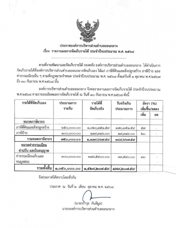 รายงานผลการจัดเก็บรายได้ ประจำปีงบประมาณ 2568