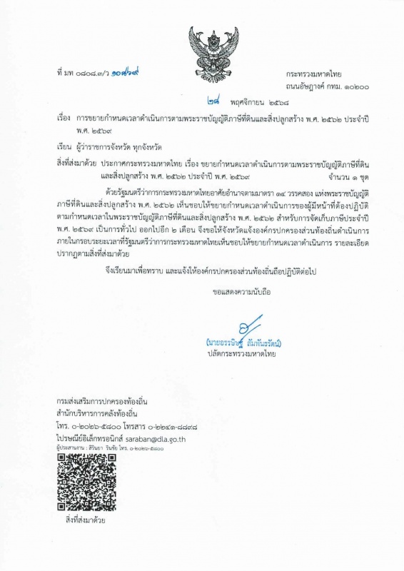 ขยายกำหนดเวลาดำเนินการตามพระราชบัญญัติภาษีที่ดินและสิ่งปลูกสร้าง พ.ศ. 2562 ประจำปี พ.ศ. 2569