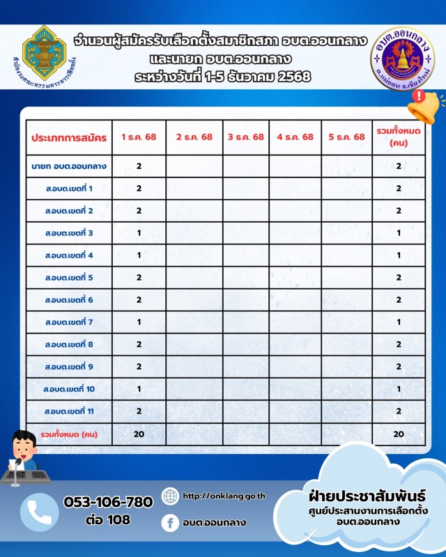 "จำนวนผู้สมัครรับเลือกตั้งสมาชิกสภา อบต.ออนกลาง และนายก อบต.ออนกลาง ระหว่างวันที่ 1-5 ธันวาคม 2568"