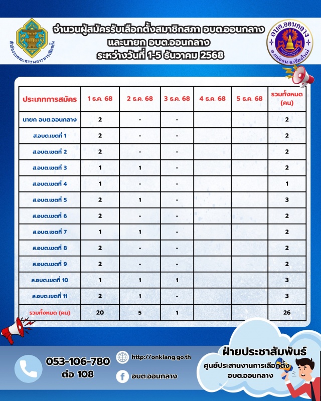 "จำนวนผู้สมัครรับเลือกตั้งสมาชิกสภา อบต.ออนกลาง และนายก อบต.ออนกลาง ระหว่างวันที่ 1-5 ธันวาคม 2568"
