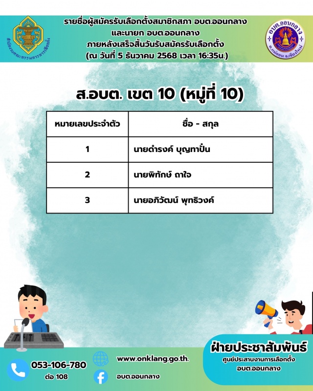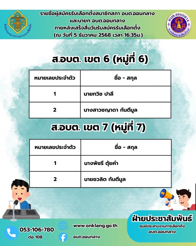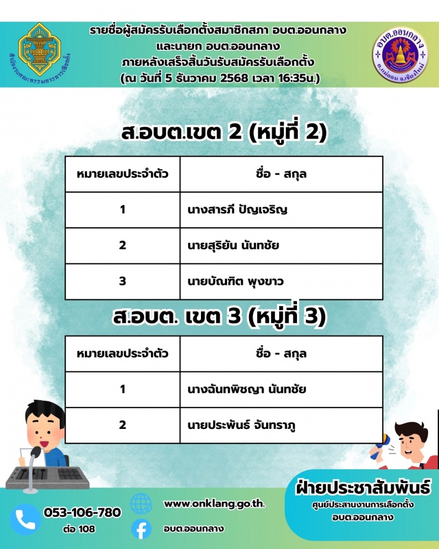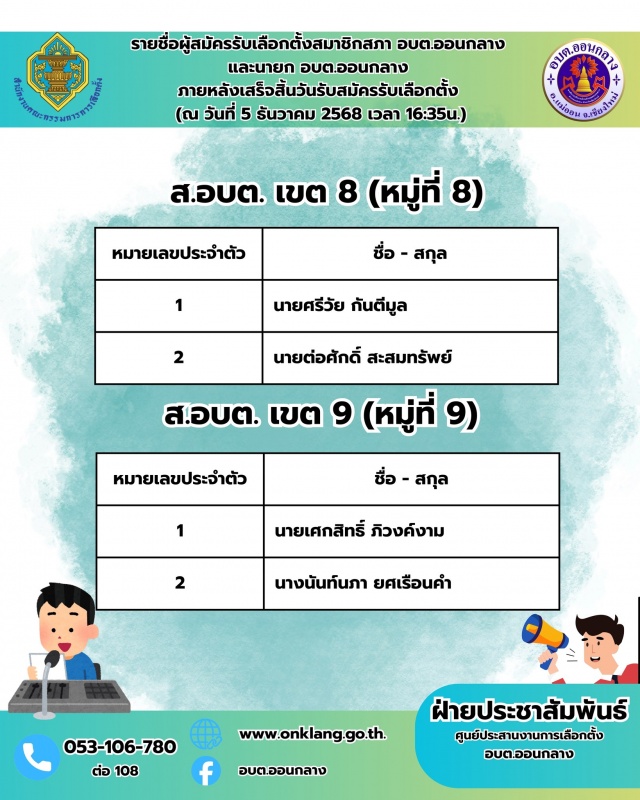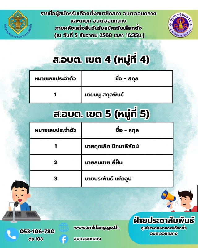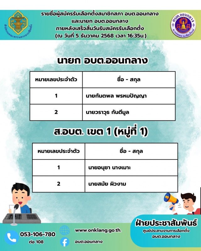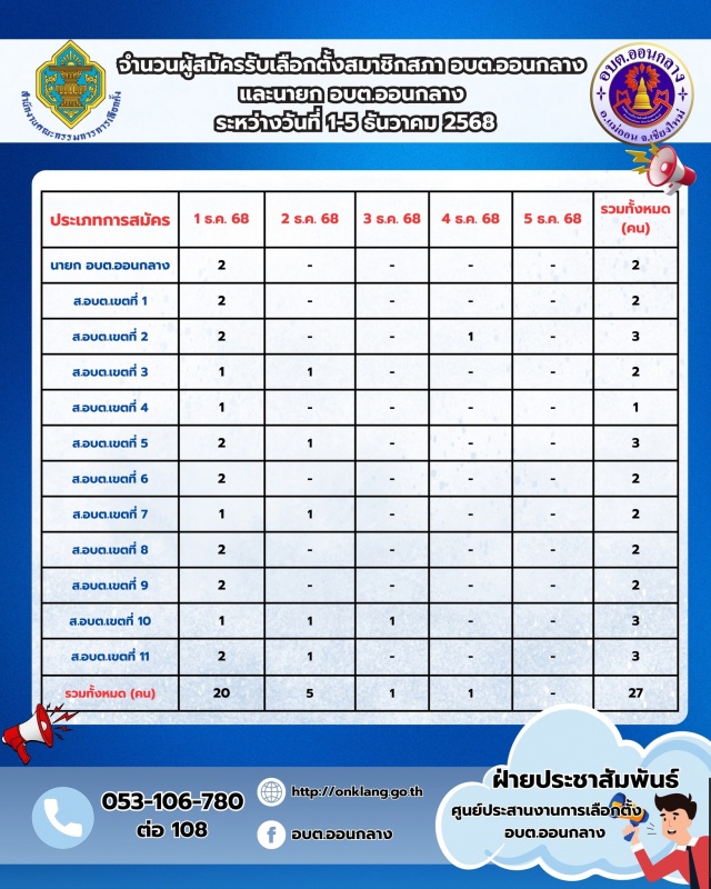 จำนวนผู้สมัครฯ และรายชื่อผู้สมัครรับเลือกตั้งสมาชิกสภาอบต.ออนกลาง และนายกอบต.ออนกลาง ระหว่างวันที่ 1-5 ธันวาคม 2568