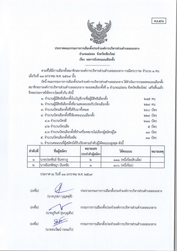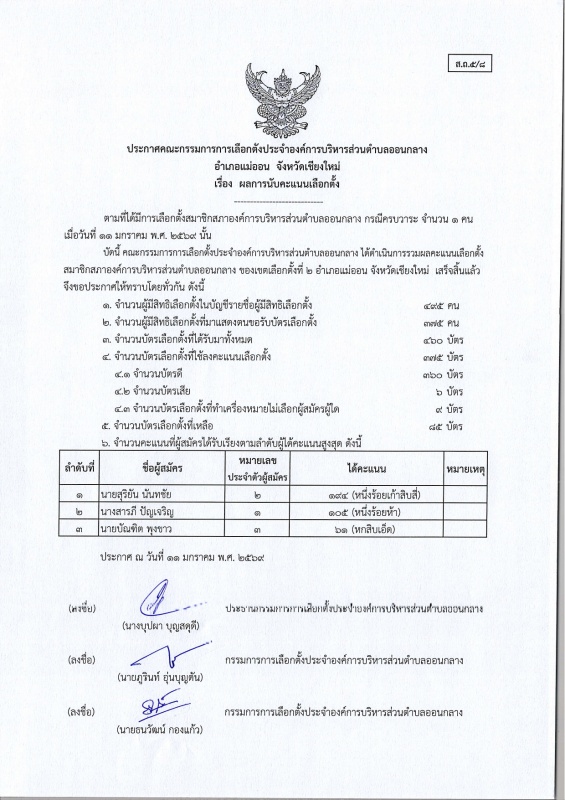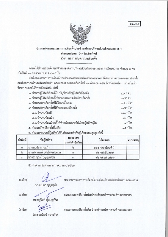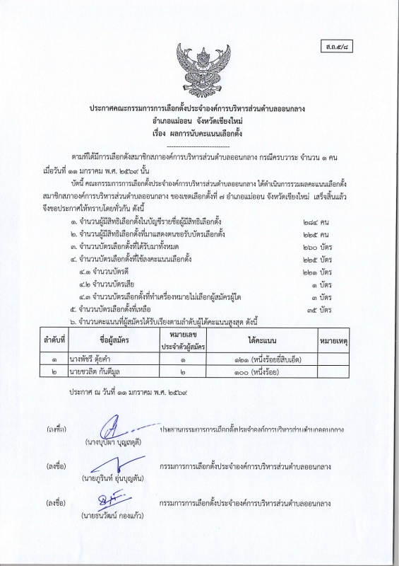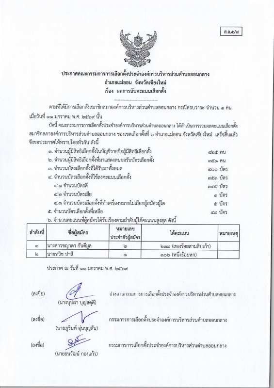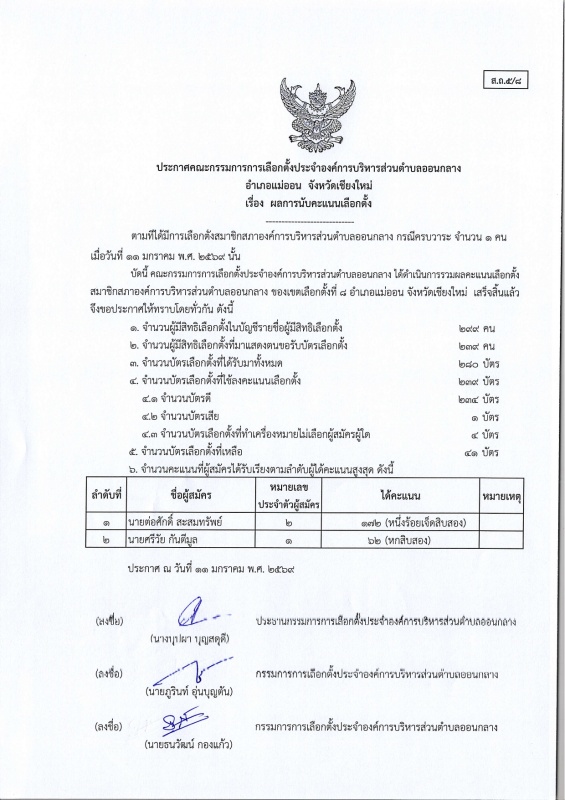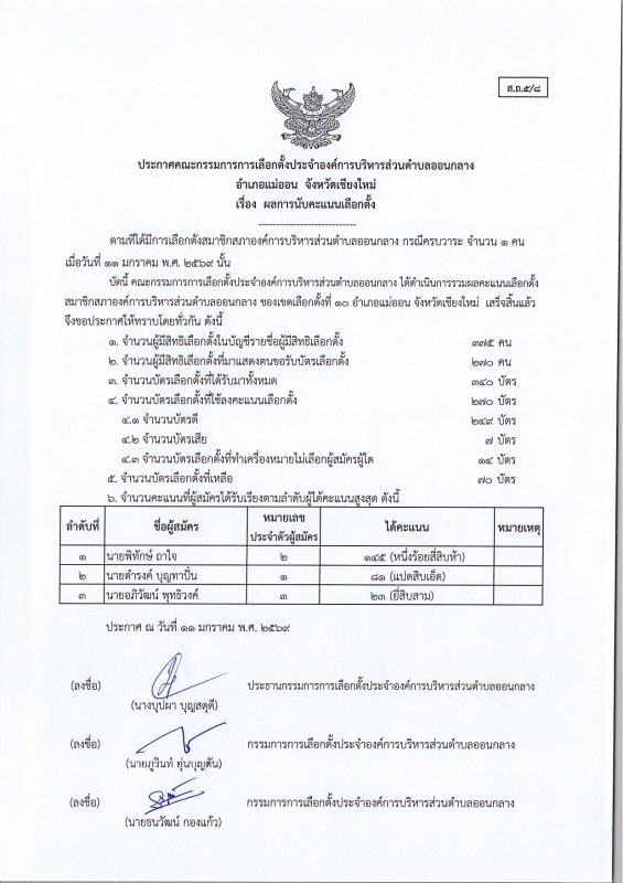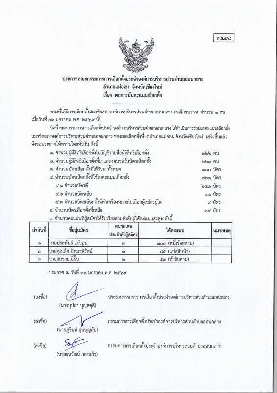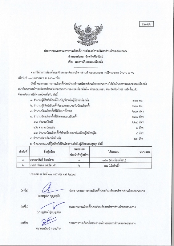 ประกาศ กกต.อบต.ออนกลาง (ส.ถ./ผ.ถ.5/8) เรื่อง ผลการนับคะแนนเลือกตั้ง