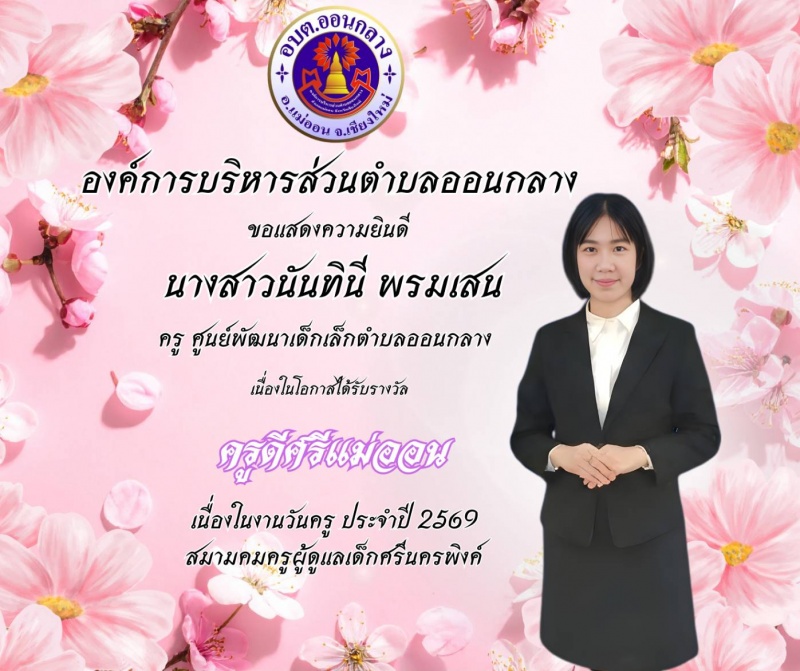 อบต.ออนกลาง ขอแสดงความยินดี นางสาวนันทินี พรมเสน และ นางสาวอรอนงค์ ก๋องแก้ว ครู ศพด.ตำบลออนกลาง เนื่องในโอกาสได้รับรางวัล ครูดีศรีแม่ออน เนื่องในวันครู ประจำปี 2569
