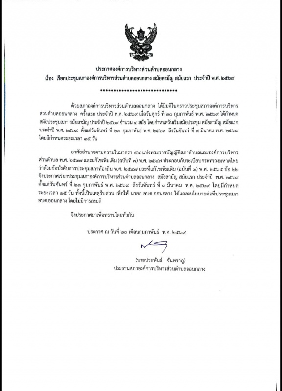 >>> ประกาศเรียกประชุมสภาอบต.ออนกลาง สมัยสามัญ สมัยแรก ประจำปี 2569