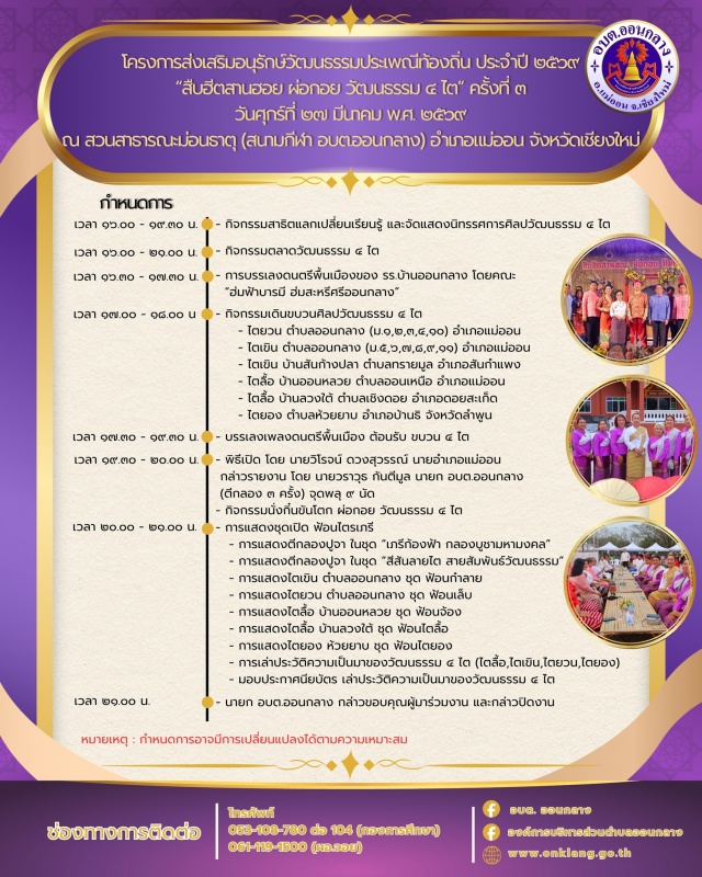 >>>ประชาสัมพันธ์ "งานสืบฮีตสานฮอย ผ่อกอย วัฒนธรรม 4 ไต ครั้งที่ 3" ในวันศุกร์ที่ 27 มีนาคม 2569 ณ สวนสาธารณะม่อนธาตุ จัดโดย อบต.ออนกลาง ร่วมกับ สภาวัฒนธรรมตำบลออนกลาง